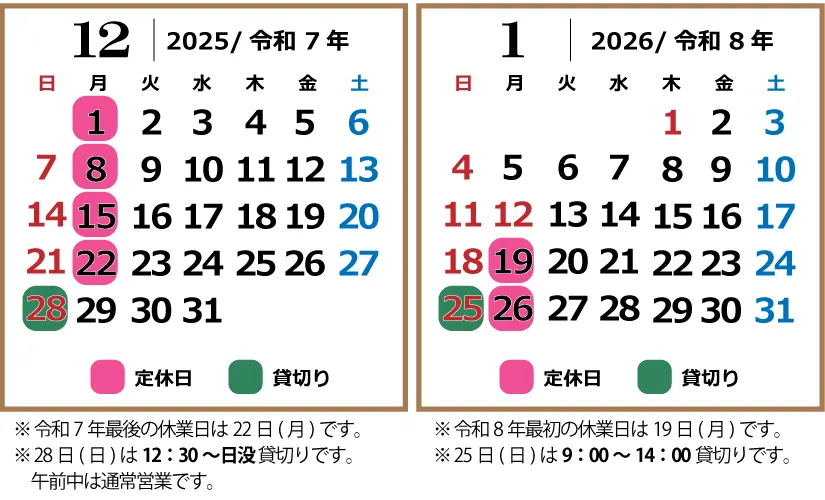 ■ 12月28日(日)12時30分~日没まで貸切りとなります。